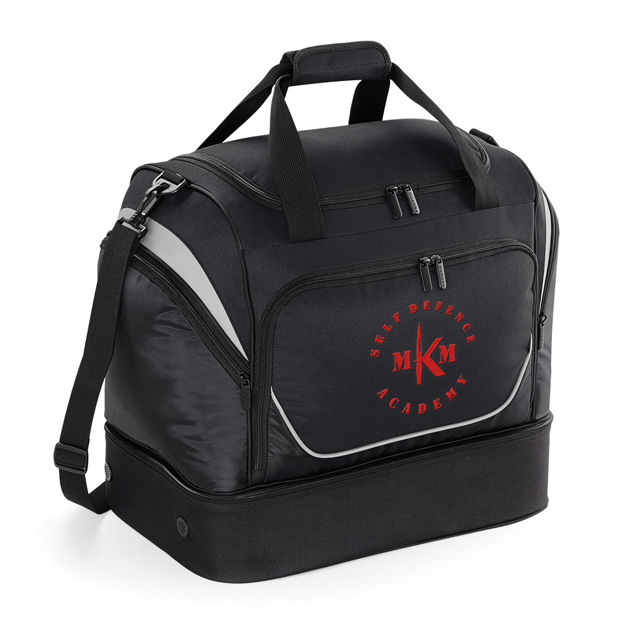 Detachable adjustable shoulder strap with pad. Dual compartment design. Structured, ventilated base compartment. Front pocket designed for easy decoration. Zippered end pockets. Internal valuables pocket. Internal mesh pockets. Padded hand grip. Reach certified.