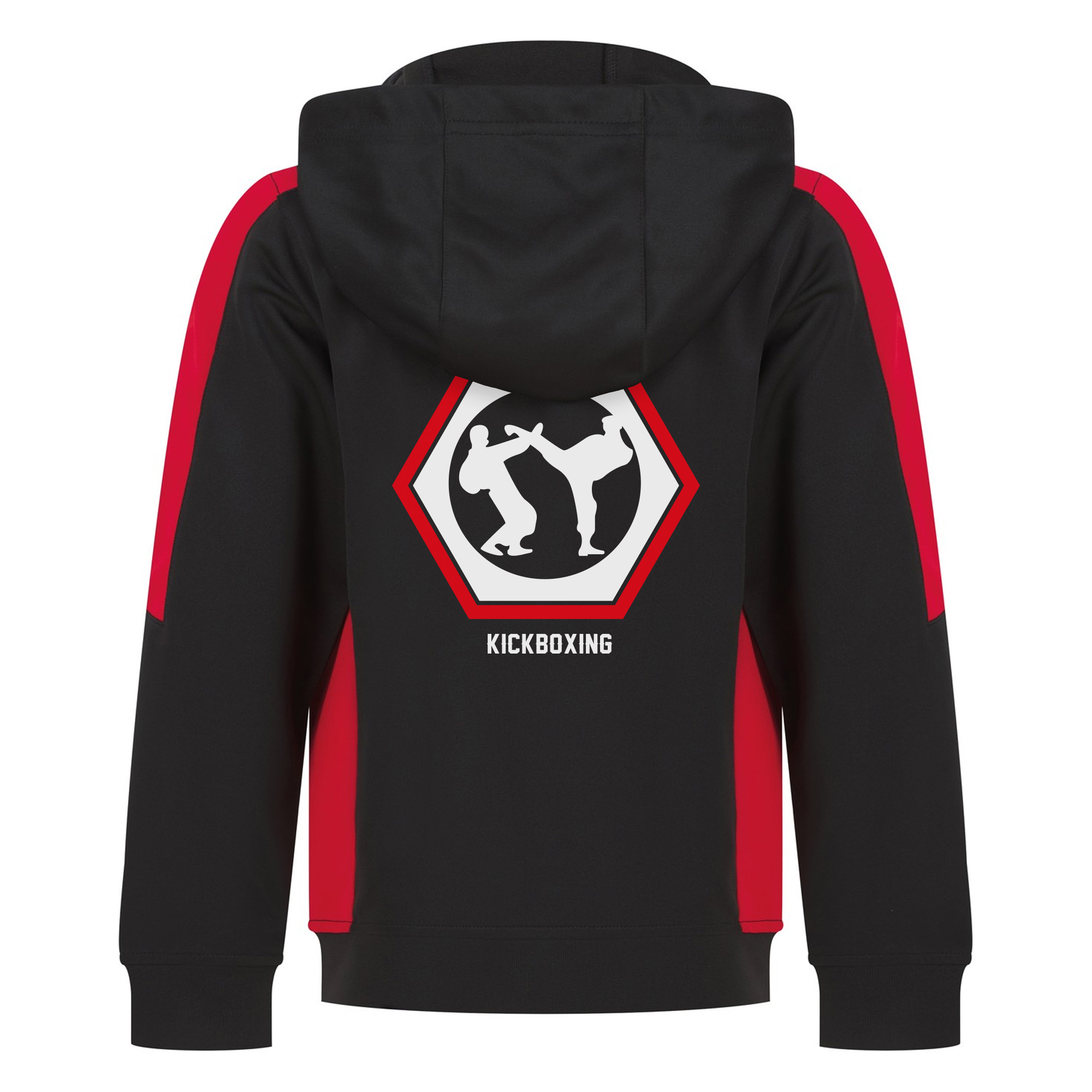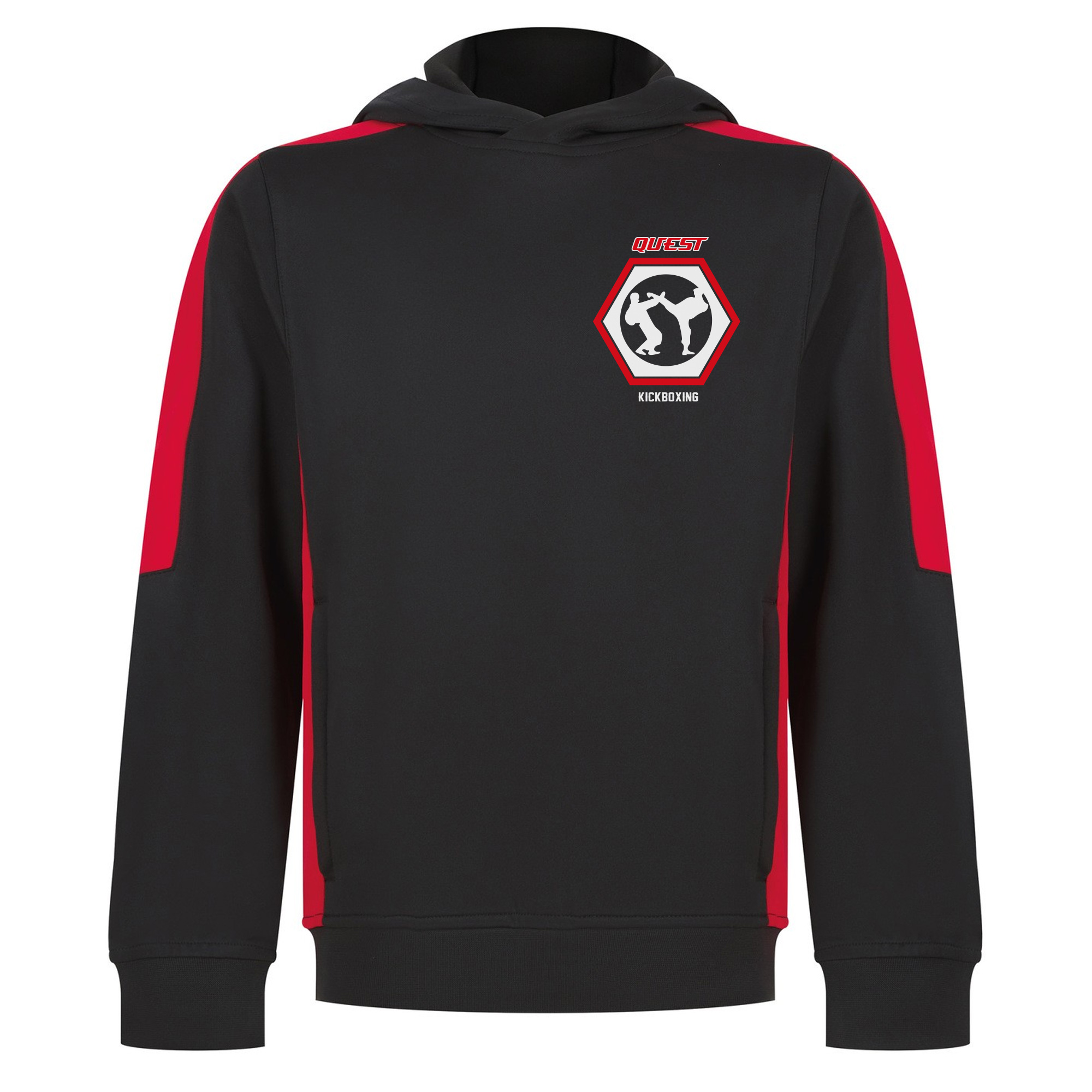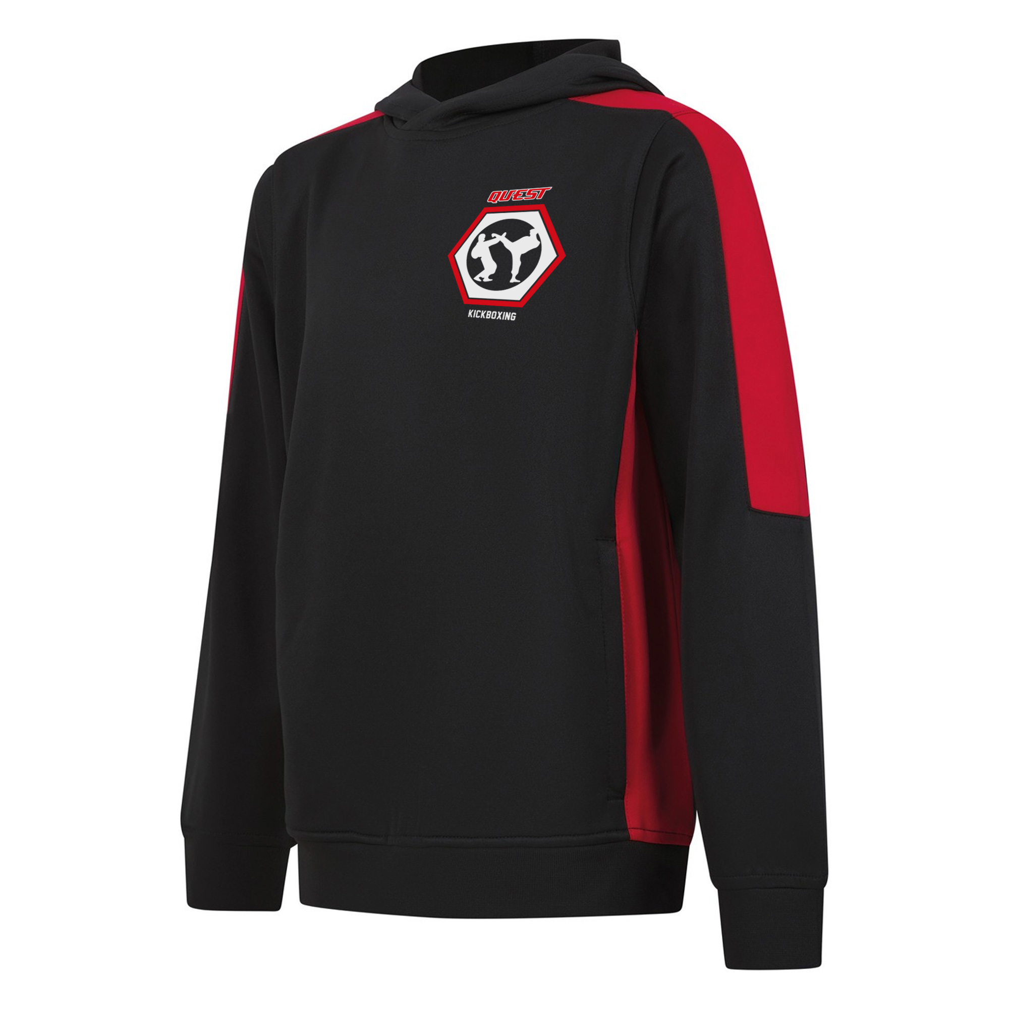Quest Kickboxing Kids Contrast Fight Team Pullover Hoodie with logo front and large logo back. Contrast sleeves and side panelling on contrast only. Ribbed cuffs and hem. Crossover hood neck at centre front. Zipped welt pocket in front panel side seam. Three-piece hood. Offered in contrast and solid colours. Amfori BSCI certified.