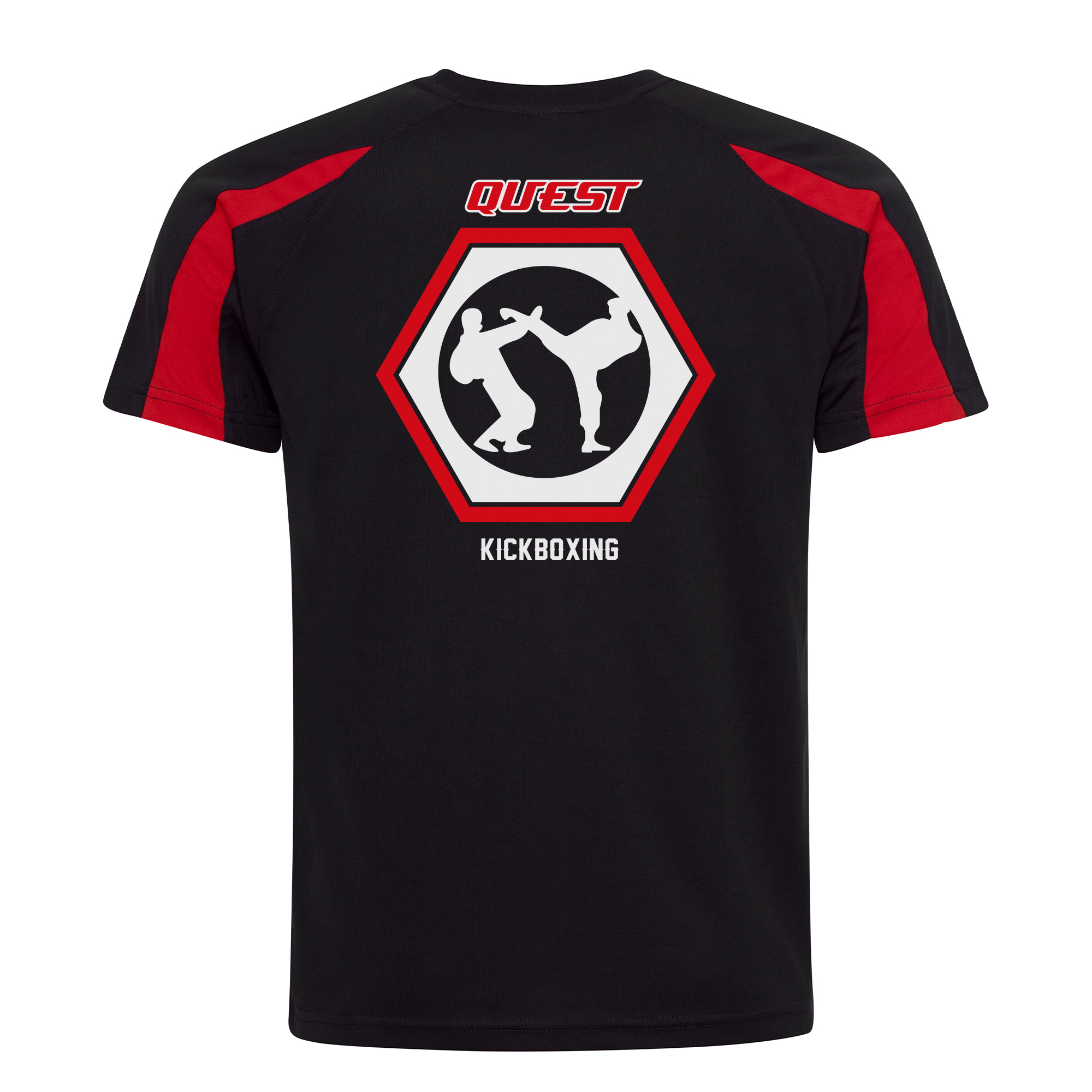 Quest Kickboxing Mens Fight Team T-Shirt with logo to front and large logo to the back. Contrast inserts on front and back sleeves. Raglan sleeve design. Textured fabric with inherent wickability and quick drying properties. UPF 30+ UV protection. Worldwide Responsible Accredited Production (WRAP) certified production. WRAP certified. Vegan certified. BSCI certified. Oeko-Tex certified. SEDEX certified.
