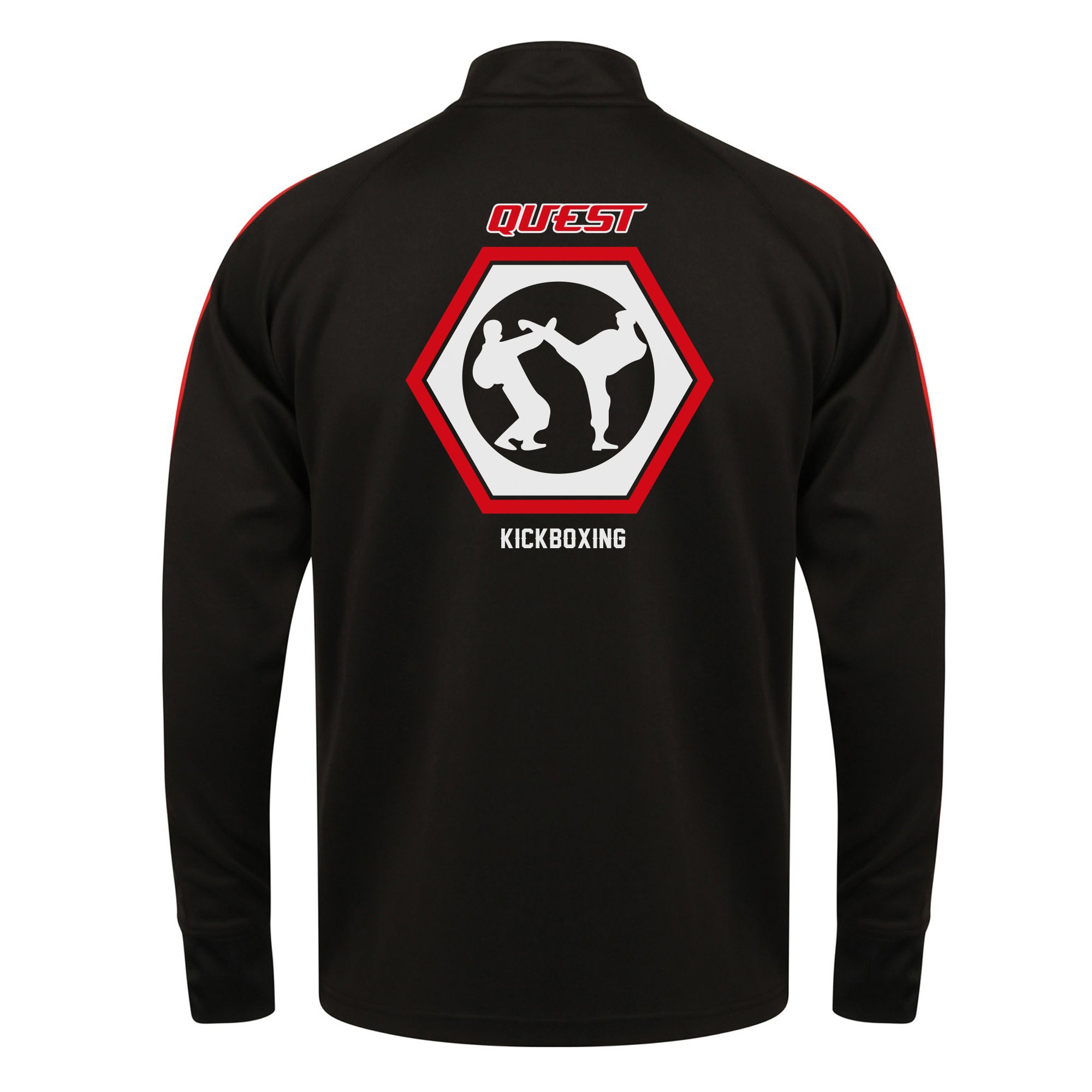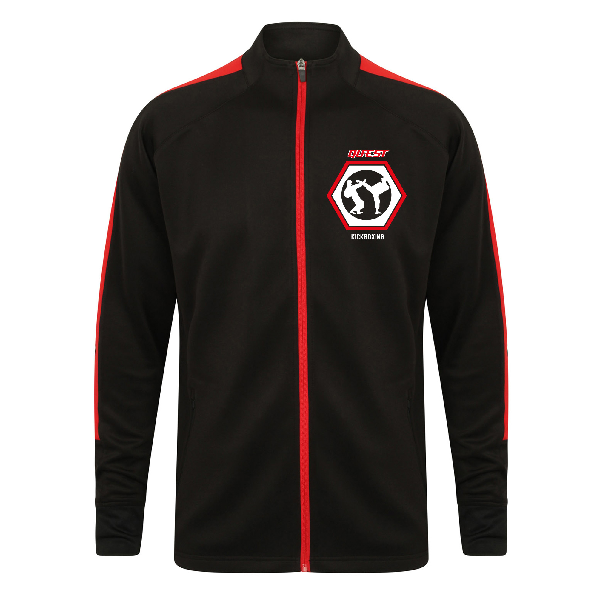 Quest Kickboxing Mens Knitted tracksuit top with contrast colour panels on outer sleeve. Contrast colour centre front zip. Zipped side pockets. Funnel neck and 1×1 ribbed cuffs. Semi-automatic lock zip sliders on all zips. WRAP certified.