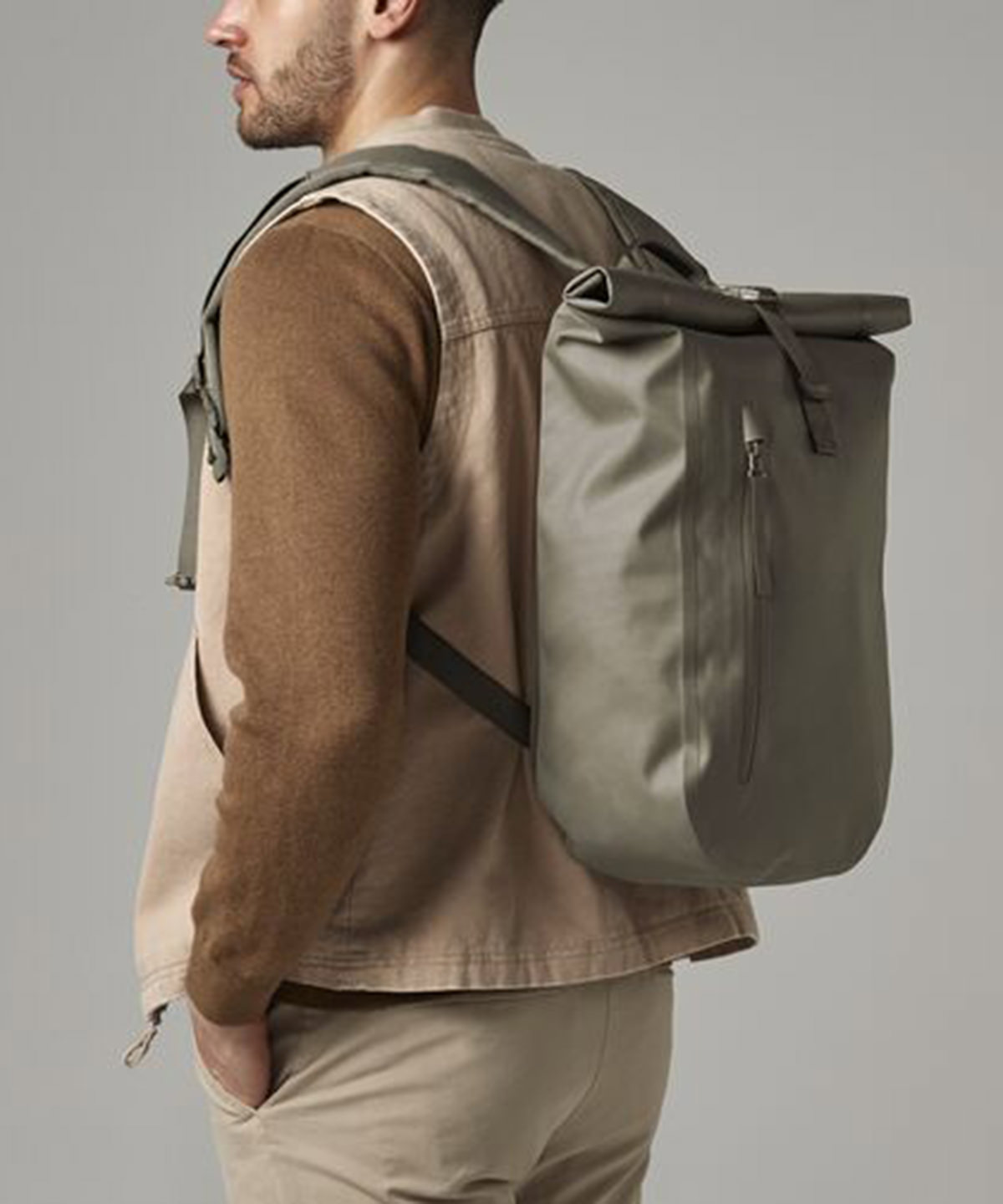 Waterproof fabric. Waterproof main compartment. Zipped front pocket. Roll-top closure. TearAway label for ease of rebranding.
